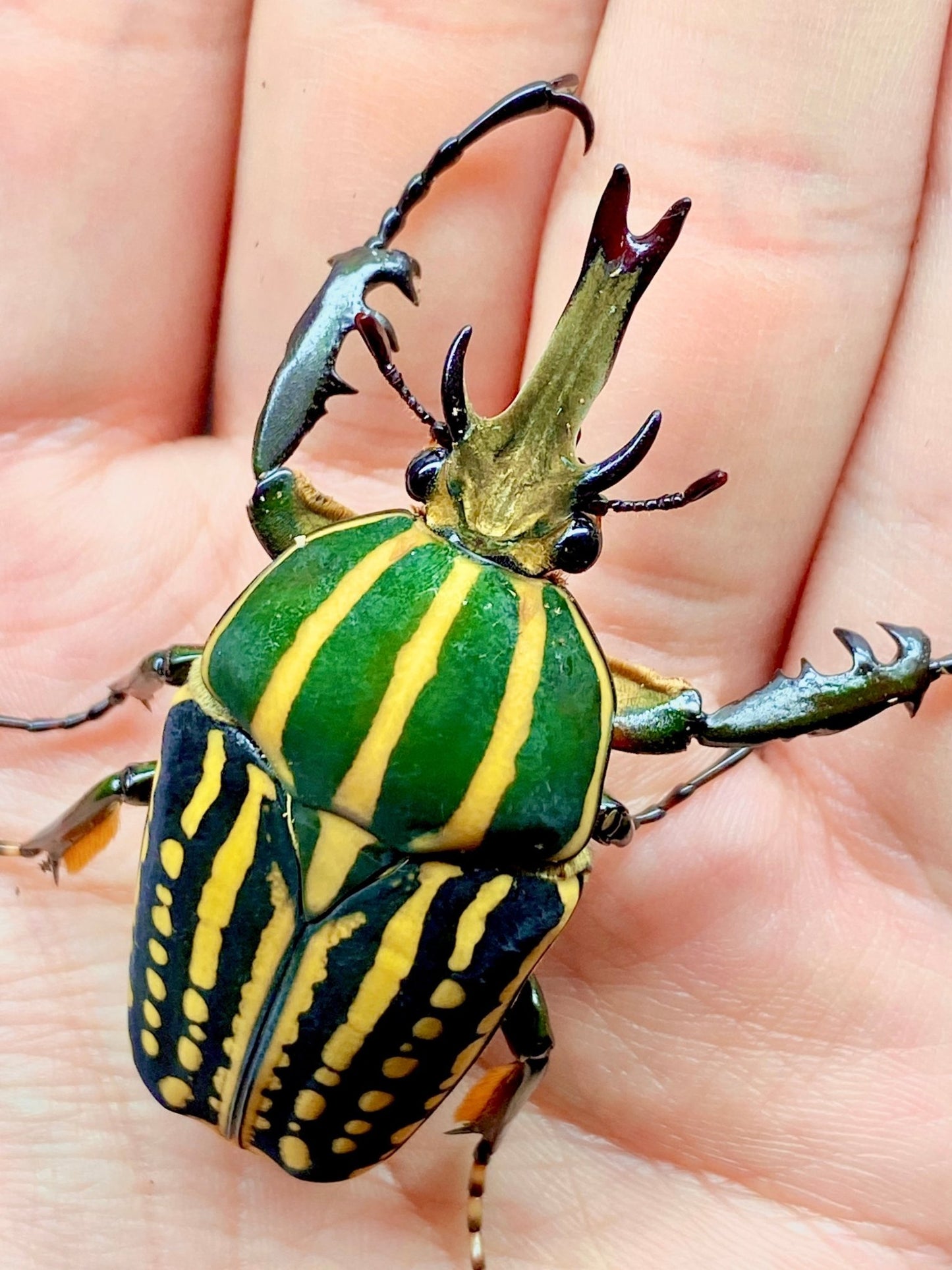 The listing is for 1x beetle larva, of a species of giant flower beetle. The adult males have a long, forked horn, and both sexes have a beautifuly patterned back.